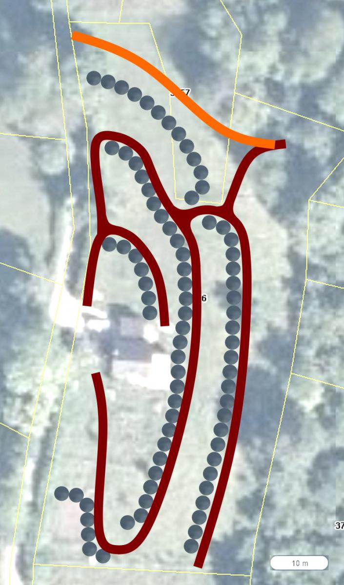 Ideja je da aromatične biljke (npr. srčenica) pruže zaštitu grmlju (lijeska) prvih 2-3 godine. Kada grmovi ojačaju, aromatične biljke se povuku malo u stranu, pokrivaju tlo, a grmlje sada pruža zaštitu stablašicama. Kada stabla malo narastu (10-15 godina), pomoći će u držanju budućih terasa. Pojas će se svake godine obogaćivati novim grmovima, npr. reznicama ribiza koji mi se odlično pokazao. Tako dobivam linearni šumski vrt koji je ujedno zid široke terase.
