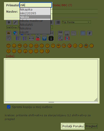 Primatelj: Korisničko ime člana kojem želite poslati poruku. Ako upišete barem prva tri slova imena, forum će vam sam ponuditi cijelo ime. Kada odaberete ime sa popisa, ono će se prikazati ispod okvira za upisivanje. Ako ste pogriješili, uz prikazano ime će se pojaviti crveni “križić” sa kojim možete obrisati primatelja i pokušati ponovno.