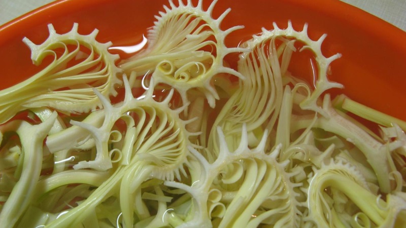 1. Ocistiti i prirediti bambuse (mozete vidjeti od japanke s velikim santoku nozem video na internetu kako to najlakse napraviti), te ih tako narezane staviti u zdjelu napunjenu vodom da se namacu 24h. Time ce se uviti i postati stakleno krhki uz potpuni gubitak gorcine.